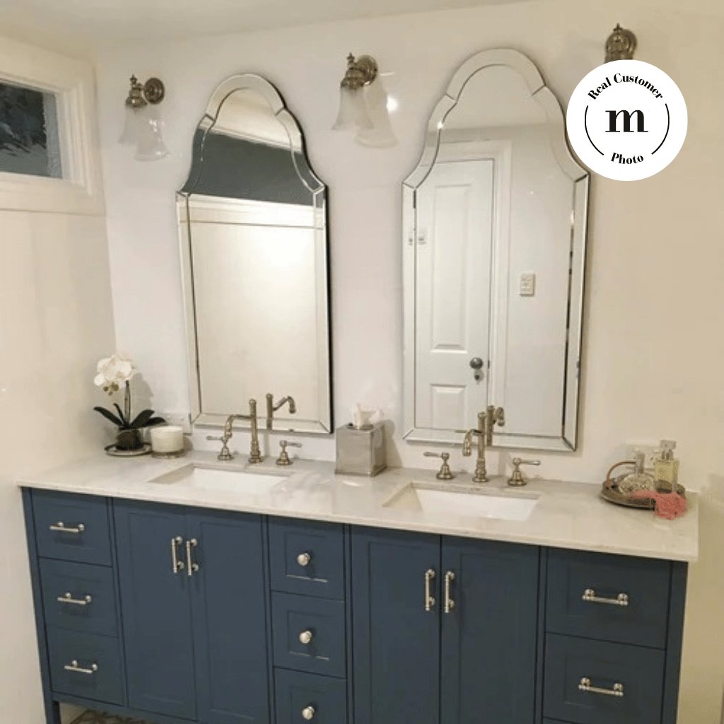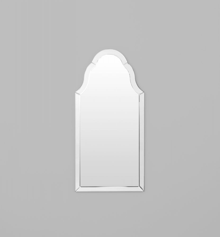 Brigitte is a semi frameless mirror with a gently scalloped arch top. Timeless neo classic styling, featuring micro bevelled glass edges.
