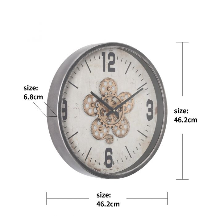 Sleek and contemporary, this beautifully crafted wall clock blends modern design with mechanical charm. Its clean matte metal frame contrasts elegantly with a natural-toned background and rustic gold inner gears, creating a striking yet versatile aesthetic. Exposed rotating gears add dynamic movement, while slender black hands glide effortlessly across the face. Protected by thick, high-grade glass, this timepiece is both stylish and durable—perfect for any modern space.